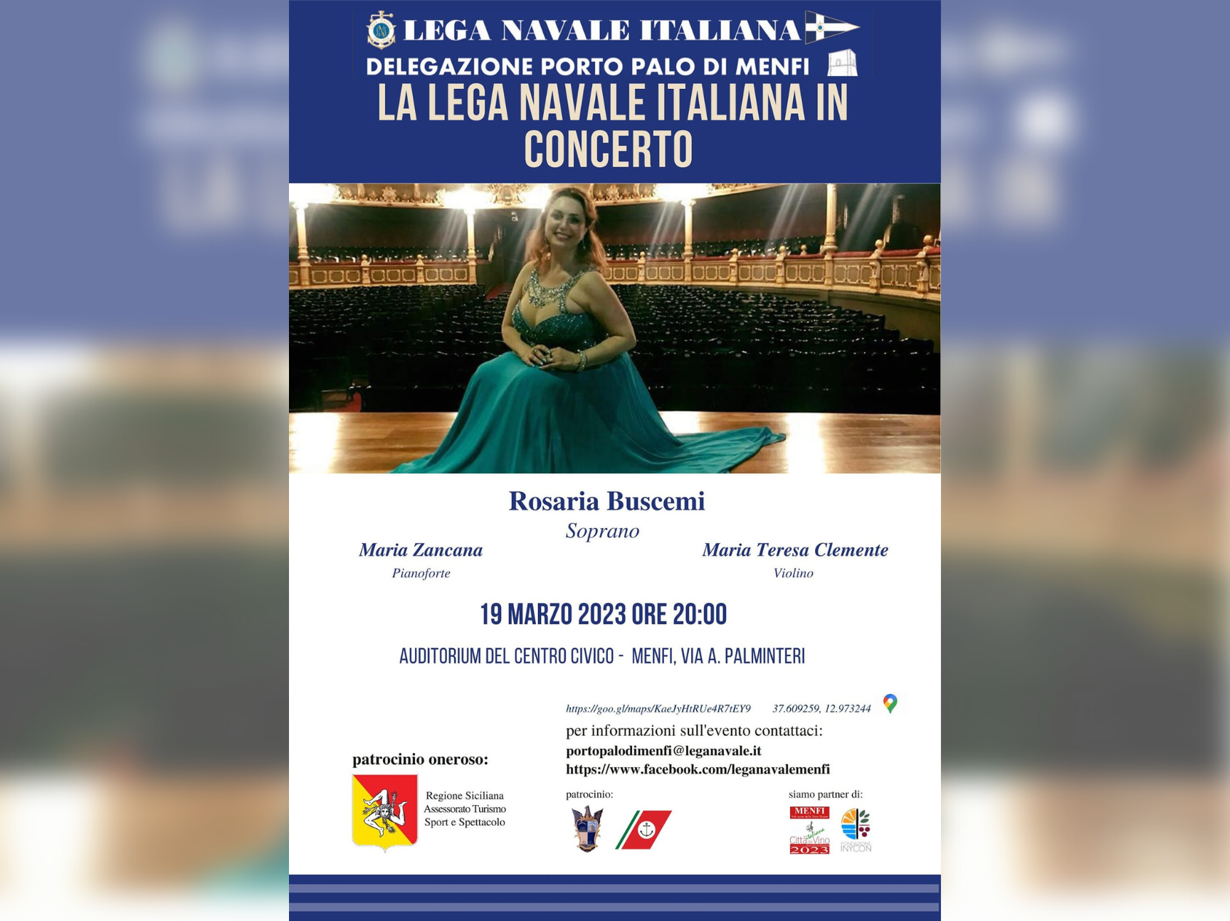La LNI di Portopalo di Menfi presenterà, domenica 19 Marzo alle ore 20, l'evento: "La Lega Navale in concerto". Ad esibirsi il soprano di fama internazionale Rosaria Buscemi. Nella serata saranno raccolti fondi per il nostro progetto sociale "Regaliamo un Sorriso".